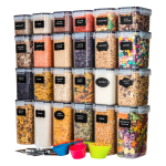 Нашият комплект е идеален за малки закуски като бонбони, мюсли, ядки и бисквити, основни продукти като брашно и зърнени храни, както и за кафе на зърна. Съхранявайте храната си в тези прозрачни контейнери за лесно съхранение, подреждане и достъп, когато Ви потрябва. Отсега нататък няма нужда да помните къде се намира всяко нещо!