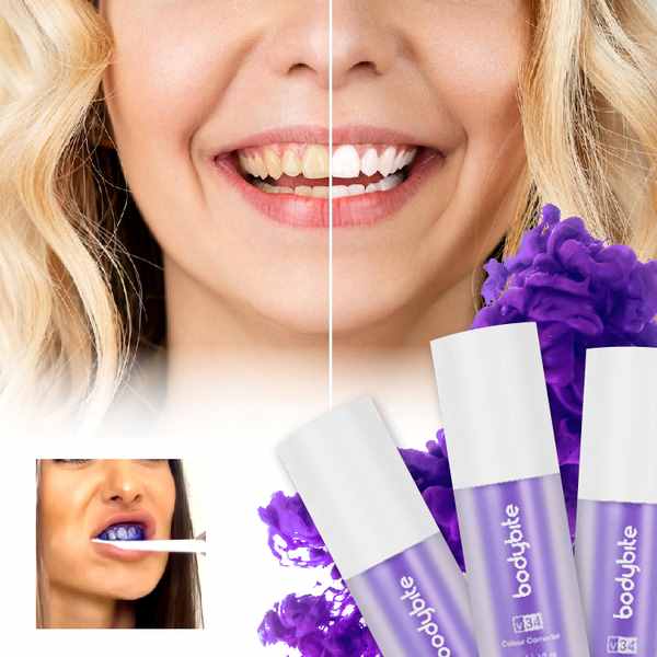 V34 използва технология за цветова корекция, за да подобри видимо яркостта на вашата усмивка. Тъй като лилавото е допълващият цвят на жълтото, формулата помага да се балансират нежеланите жълти тонове за по-равномерен и сияен вид. Резултатът е мигновено по-свежа усмивка — без агресивни процедури или сложни стъпки.