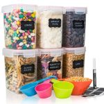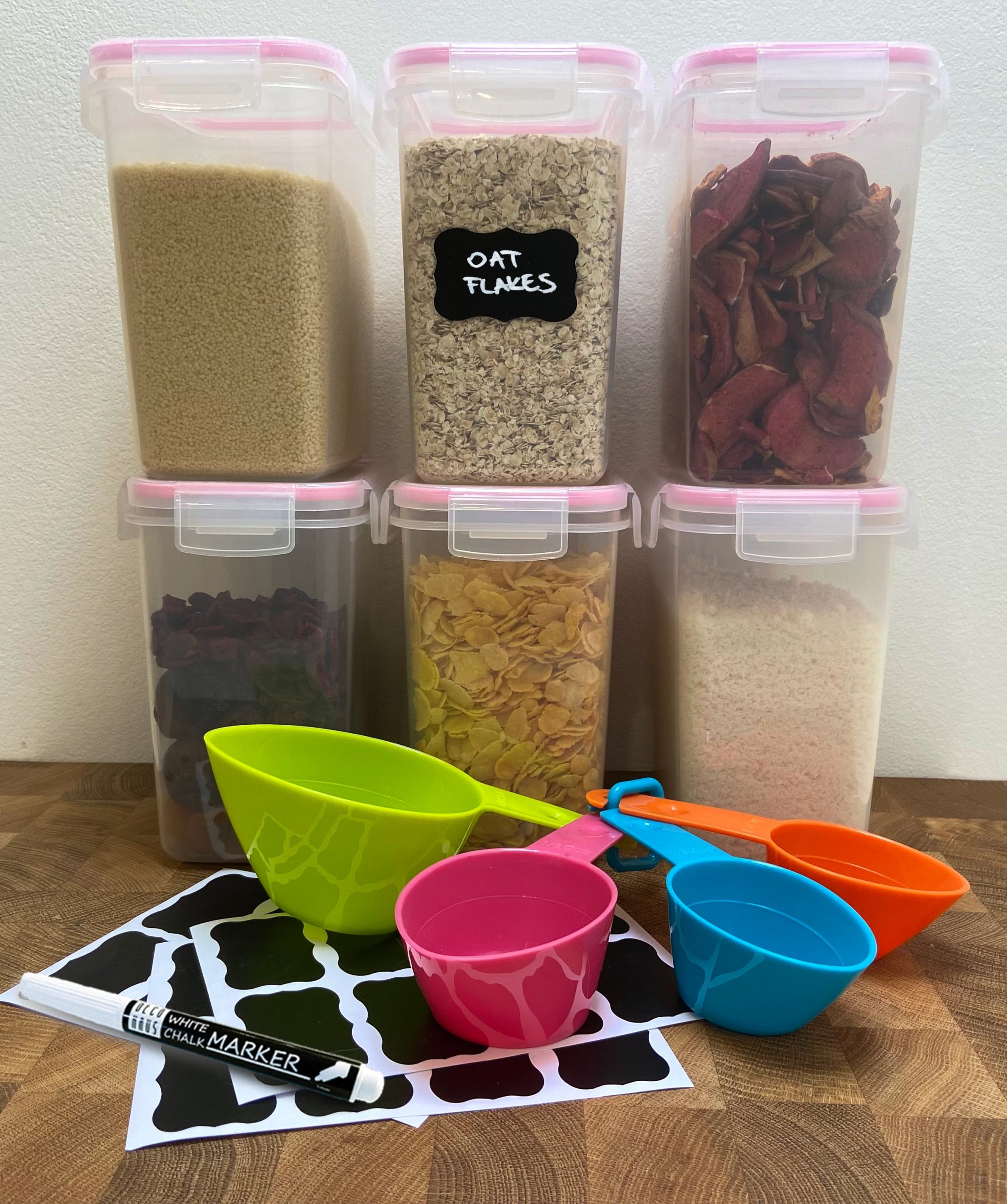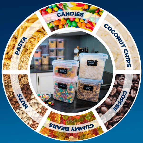 Нашият комплект е идеален за съхранение на закуски като бонбони, мюсли, ядки и бисквити, основни продукти като брашно и храни за закуска като кафе. Съхранението в тези прозрачни контейнери е лесно, а вашите хранителни стоки ще бъдат добре организирани и винаги под ръка. Никога повече няма да забравите къде сте запазили нещо!