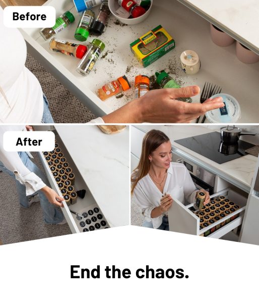 Тези стелажи могат да се поставят върху плота или да се монтират на стената. Те предлагат перфектен поглед върху всичките Ви подправки и заедно с бурканчетата за подправки със сигурност ще бъдат новият акцент в кухнята Ви!