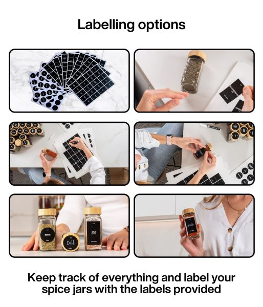 - ✅ НЕ САМО ЗА ПОДПРАВКИ И НЕ САМО ЗА КУХНЯТА – Този комплект за съхранение на подправки може да се използва и за съхранение на материали за ръчно творчество, декорации и витамини! Поддържайте бурканчетата чисти без усилие с включената в комплекта четка.
