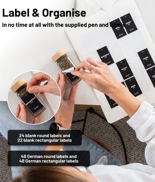 - ✅ НАПИШЕТЕ ПОДПРАВКИТЕ СИ КАТО ПРОФЕСИОНАЛИСТ! – Комплектът бурканчета за подправки с капачки включва и 96 отпечатани етикета на Немски език с най-често срещаните подправки, както и 46 празни, които можете да персонализирате с включената тебеширена писалка.
