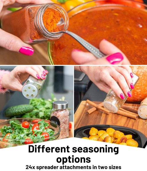 - ✅ СЪЗДАДЕНИ ЗА ВАШЕТО УДОБСТВО – Капачките осигуряват херметично затваряне, запазвайки подправките Ви свежи по-дълго време! Комплектът включва 2 капака с отвори с различни размери. Използвайте силиконовата фуния за пълнене без разсипване!