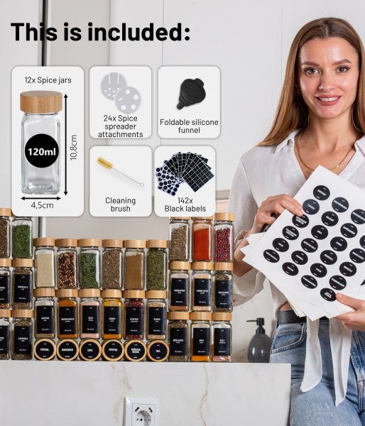 Deco Haus Комплект от 12 бурканчета за подправки с бамбукова капачка на винт – комплект бурканчета за подправки с етикети, фуния, четка за почистване, маркер – подходящи за нашите двустенни рафтове за подправки – празни, от прозрачно стъкло, за съхранение и дозиране, 120 ml, 10,5×4,3 cm