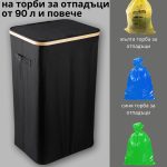 Този модел може да се похвали с подсилени шевове, издръжливи материали и естетически изтънчен черен цвят, който се вписва безпроблемно във всяко пространство – независимо дали става дума за модерен офис или минималистична кухня. Компактният му, но просторен дизайн позволява ефективно рециклиране, без да заема прекалено много място. Освен това кошчето има бамбукова рамка с железен пръстен, към който се закрепва торбичката за отпадъци, което улеснява смяната и използването му. Кошницата е проектирана за торби за отпадъци с обем 90 л, но лесно можете да използвате и по-големи.