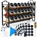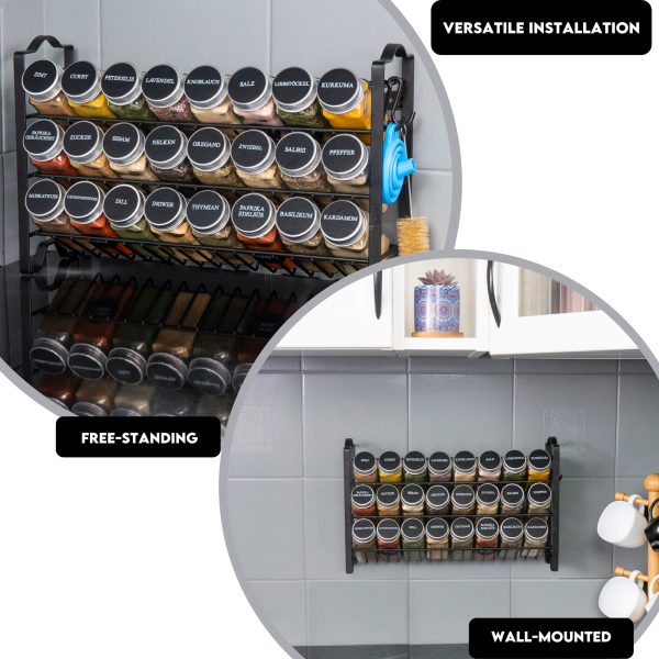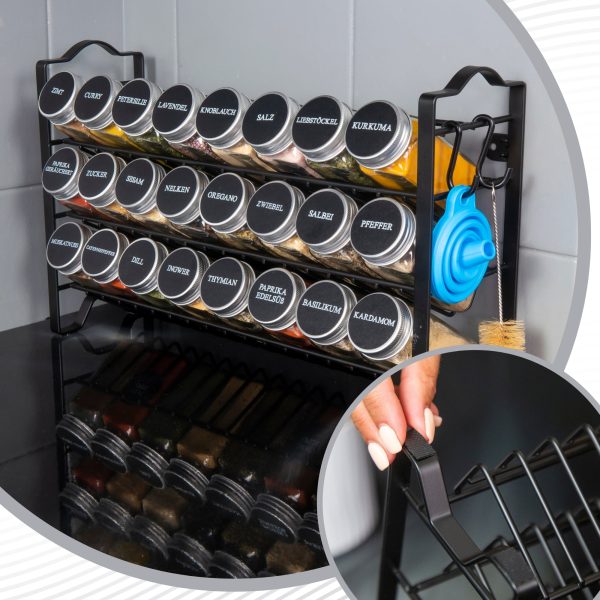 Deco Haus стойка за подправки с бурканчета за подправки – 3-етажен метален стелаж – кухненски комплект органайзер, стелаж за подправки с 24 бурканчета за подправки, 48 етикета, четка, фуния, кукички – за поставяне на плота или окачване стена – черен