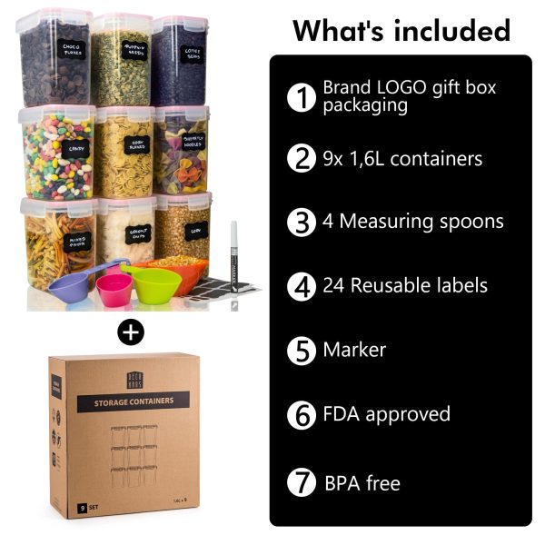✅ МНОГО ПРОСТРАНСТВО – В комплекта има 9 контейнера, всеки с вместимост 1,6 л, така че ще разполагате с много място за организиране на покупките си!