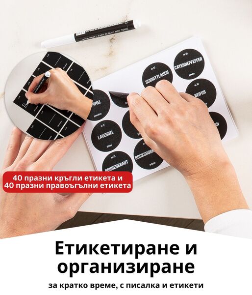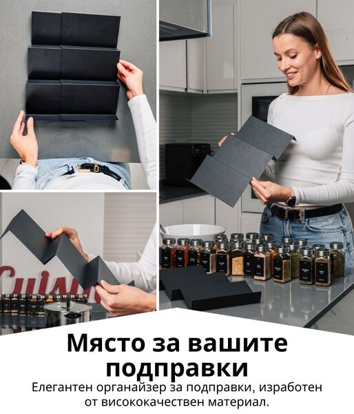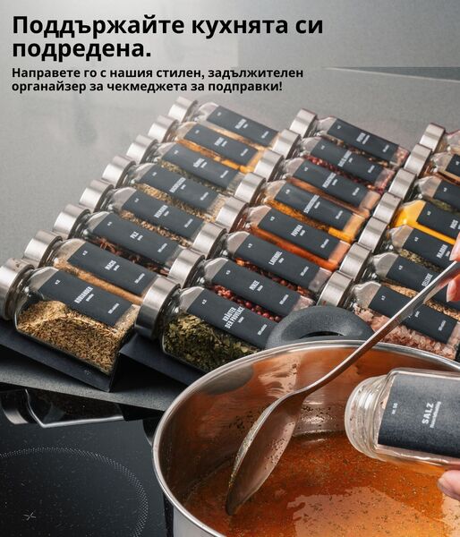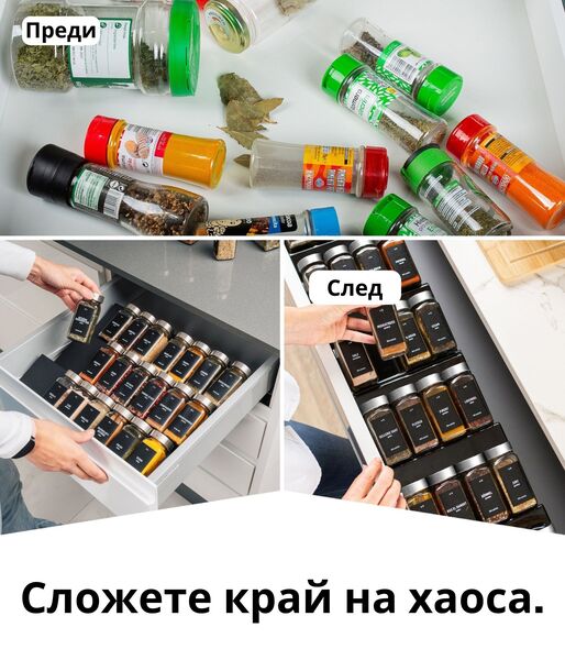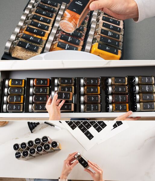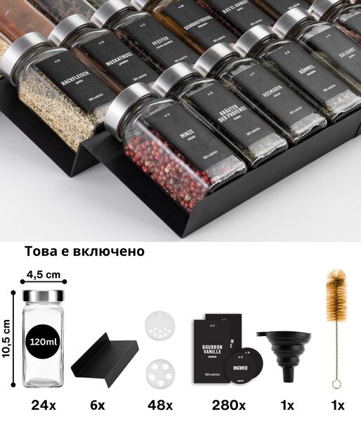 • ВЪВЕЖДАНЕ НА РЕД В КУХНЯТА – Т Този комплект съдържа 6 органайзера за чекмеджета, 24 бурканчета за подправки, 280 черни етикета, четка, два шейкъра и фуния.
