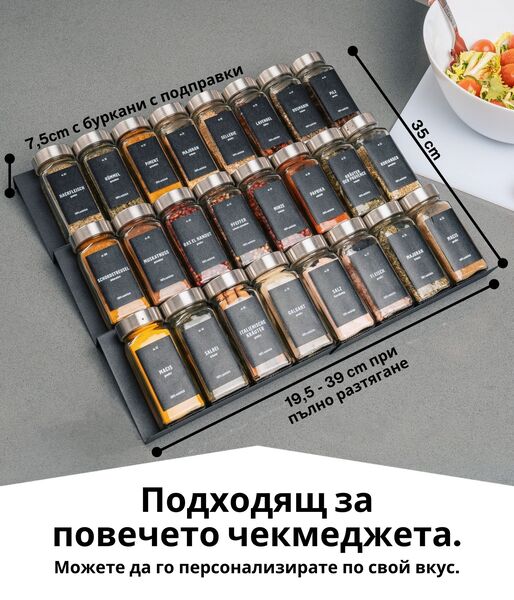 • РЕГУЛИРУЕМА ШИРОЧИНА: С размери 19,5 x 35 см, поставката за подправки се вписва добре в стандартни кухненски чекмеджета и при необходимост може да се разшири до максимална ширина от 39 см.