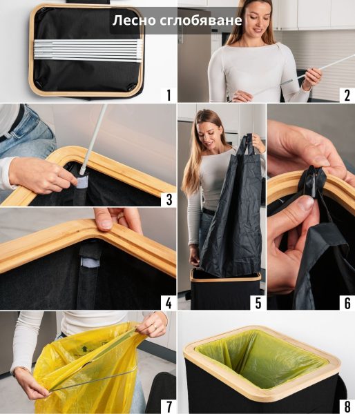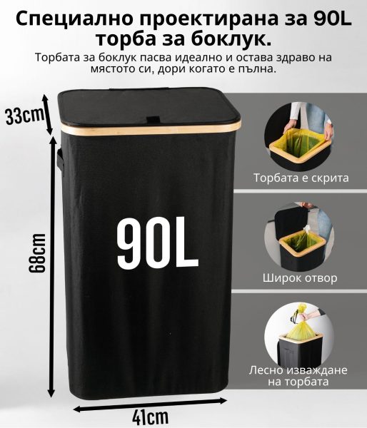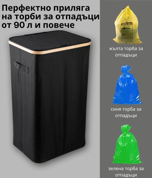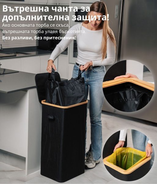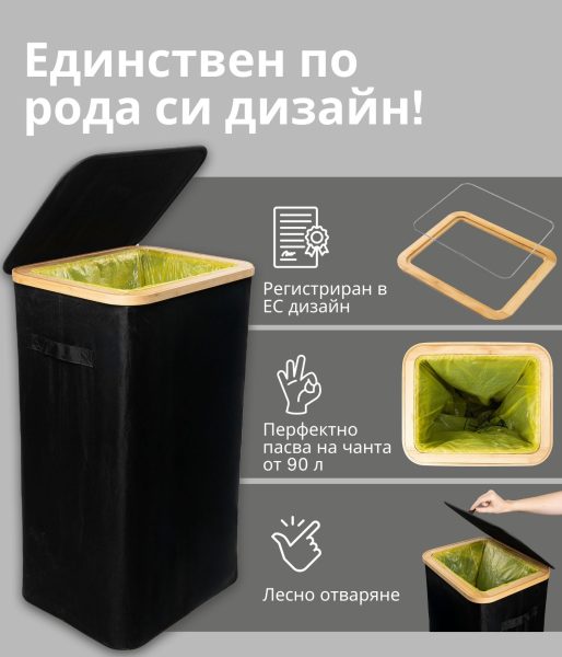 Този модел може да се похвали с подсилени шевове, издръжливи материали и естетически изтънчен черен цвят, който се вписва безпроблемно във всяко пространство – независимо дали става дума за модерен офис или минималистична кухня. Компактният му, но просторен дизайн позволява ефективно рециклиране, без да заема прекалено много място. Освен това кошчето има бамбукова рамка с железен пръстен, към който се закрепва торбичката за отпадъци, което улеснява смяната и използването му. Кошницата е проектирана за торби за отпадъци с обем 90 л, но лесно можете да използвате и по-големи.
