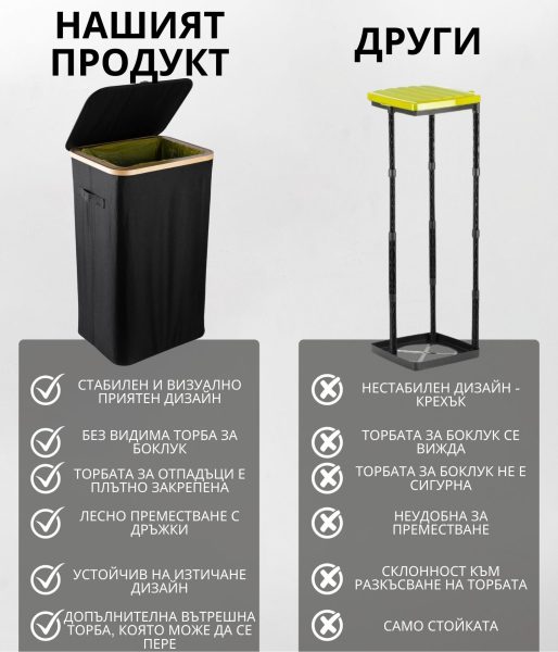 • ИНОВАТИВЕН ДИЗАЙН: Нашата патентована бамбукова рамка с метален пръстен здраво държи торбата за боклук на място и я предпазва от провисване. Капакът от плат дискретно прикрива отпадъците и помага да не се появяват миризми.